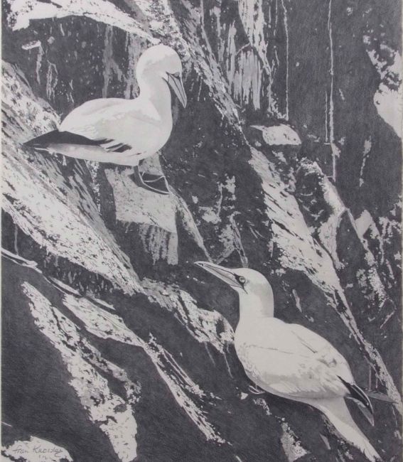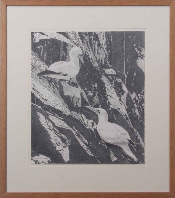 AR Fran Knowles (contemporary), pair of Gannet on a cliff, pencil drawing, signed lower left, 47 x 40cm