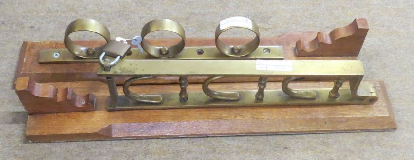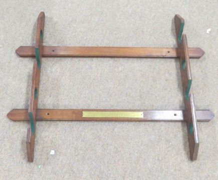 Vintage wall mounted wooden gun rack for four guns, presented by Graham, Graham & Co, Pheasant food makers, Trowse, Norfolk, together with one other in two parts (3)
