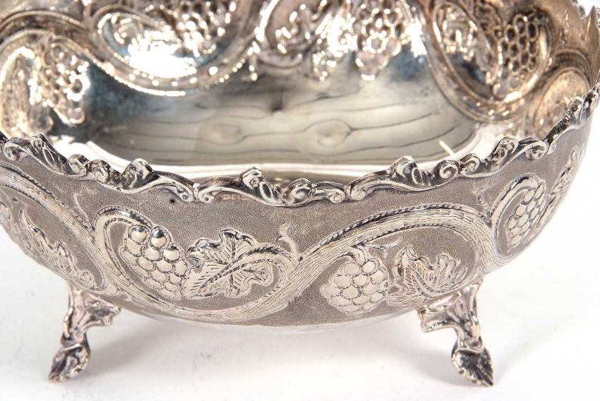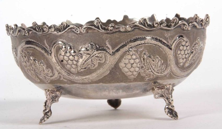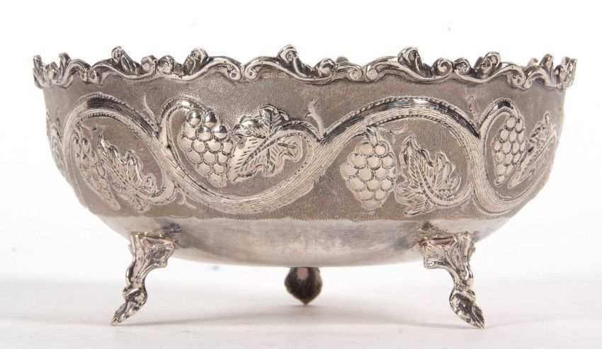 A vintage white metal 830-Cyprus bowl decorated with a vine and grape design and supported on three cast leaf feet, stamped beneath 830, 17cm diameter, 278gms