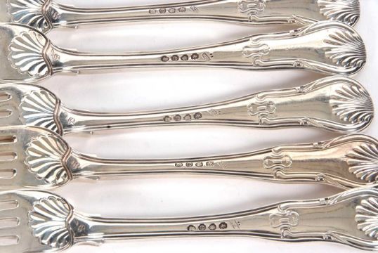 Six George IV silver Kings pattern table forks, double struck, London 1820, makers mark for William Eaton, 626gms