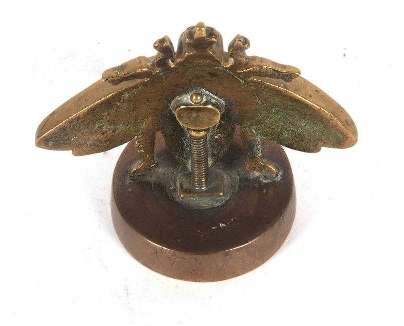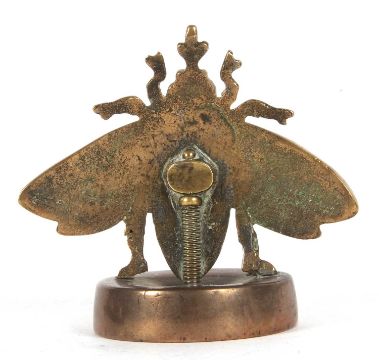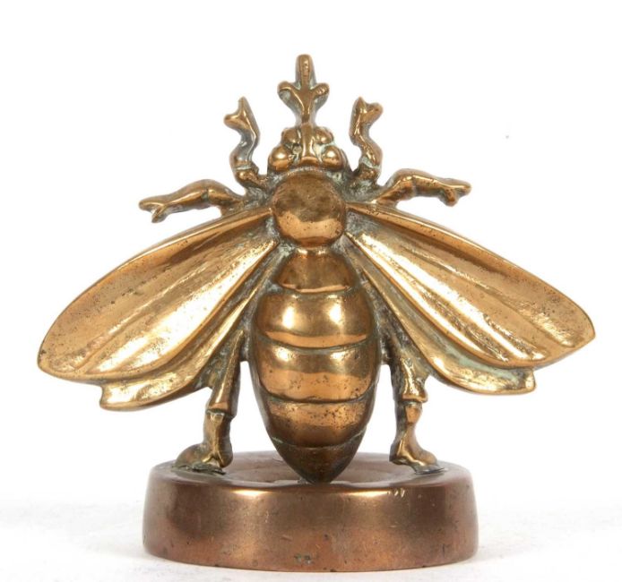 A large vintage bronze bee desk paperweight the base marked with letters and devices, the wingspan is 12cm, 11.5cm tall