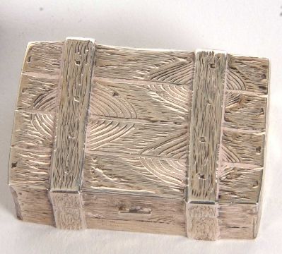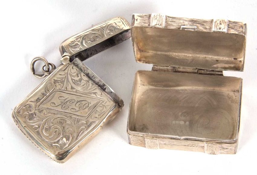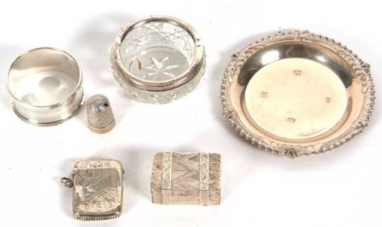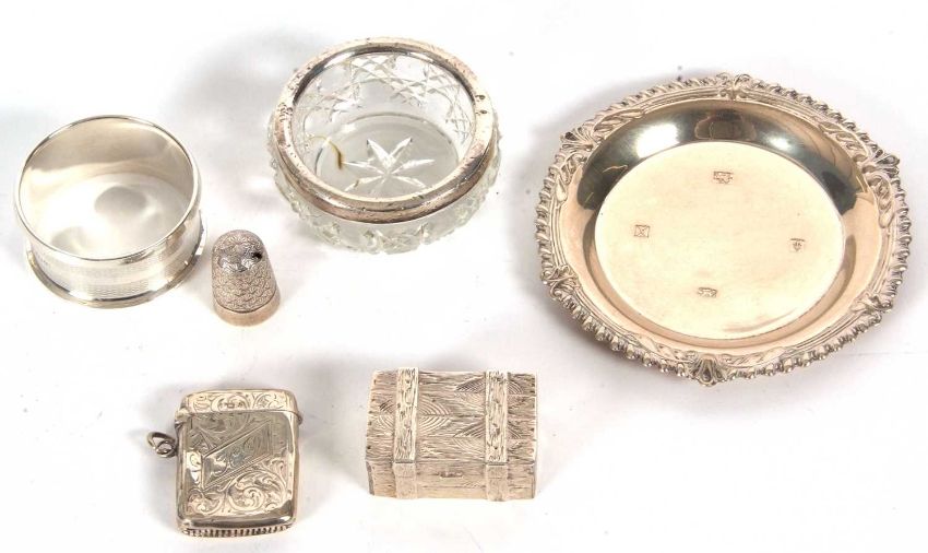 Mixed Lot: A small silver dish, Birmingham 1972, makers mark for A T Callon Ltd, 9.5cm diameter, a modern white metal pill box in the form of a travelling trunk, London import mark for 1978, a silver serviette ring, Birmingham 1939, a silver vester, Birmingham 1913, a hallmarked thimble, Chester 1910, makers mark for Charles Horner together with a cut glass open salt with a silver rim, makers mark rubbed, silver weight 103gms