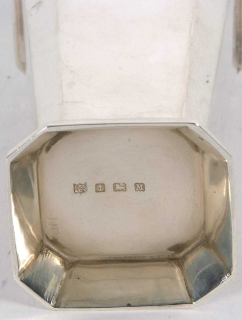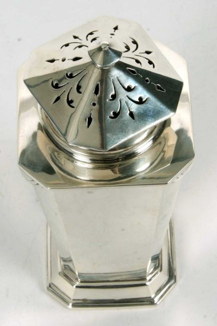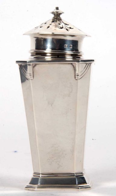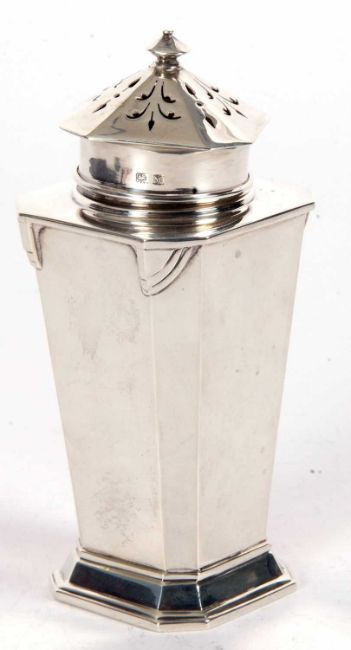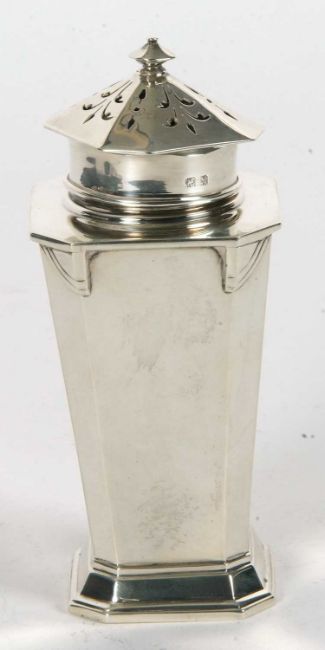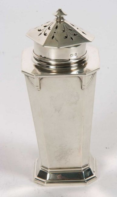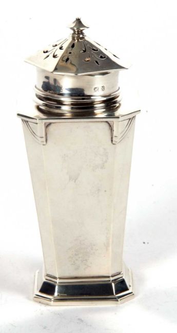 An Art Deco silver caster of plain tapering octagonal form with angular designed shoulders, pull off pierced lid to a spreading foot, Birmingham 1936, Charles S Green & Co Ltd, 14cm tall, 192gms