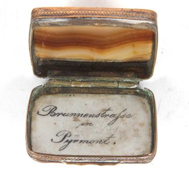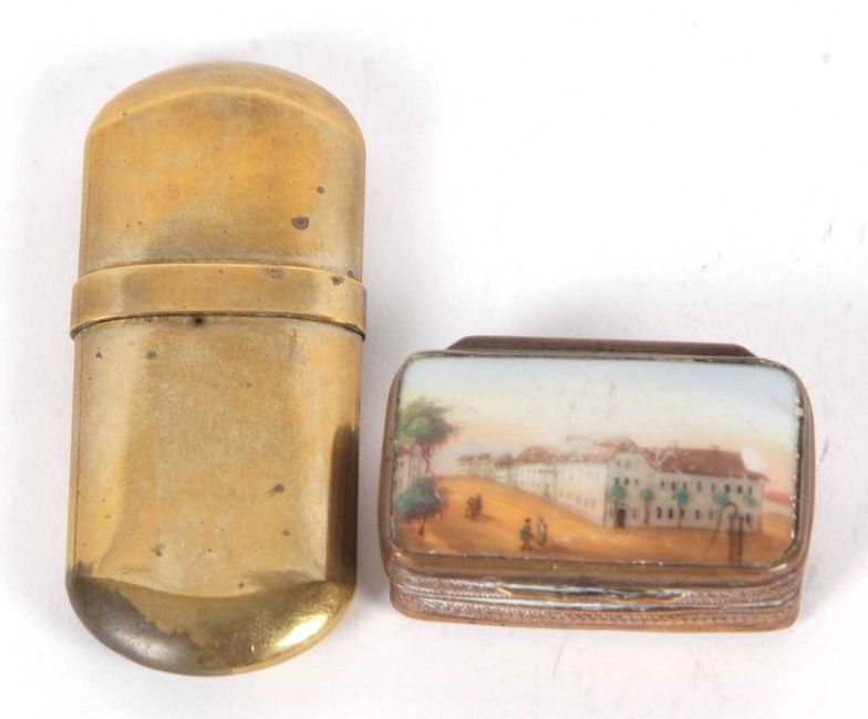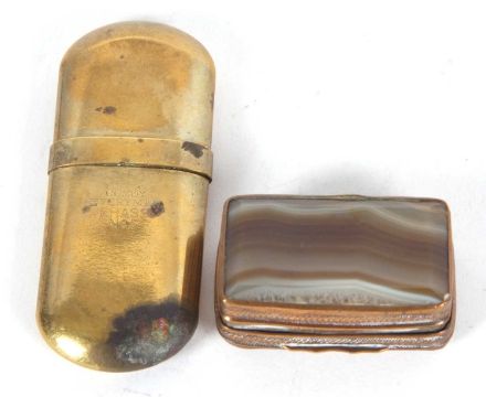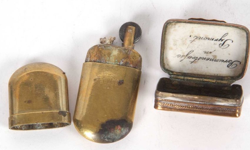 Mixed Lot: An antique metal framed French agate and hand painted porcelain pill box together with a Comoy Everyman No 5 brass trench lighter (2)
