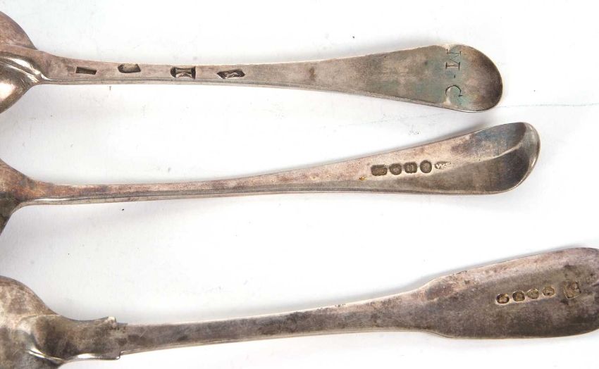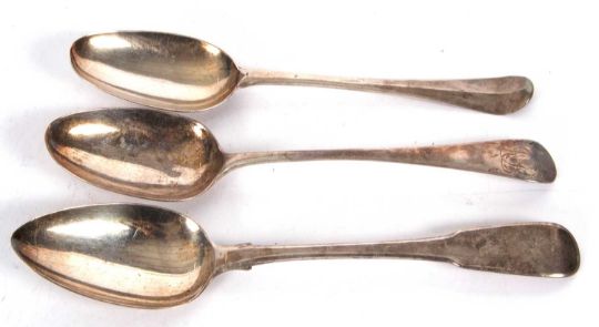 Mixed Lot: George II Hanovarian rat tail spoon, London 1725, makers mark for James Wilks, 20cm long, a George III Old English patter spoon, initialled, hallmarked for London 1788, makers mark for William Sumner I, together with a George III fiddle pattern tagle spoon, London 1814, makers mark for Peter & William Batemen, 192gms