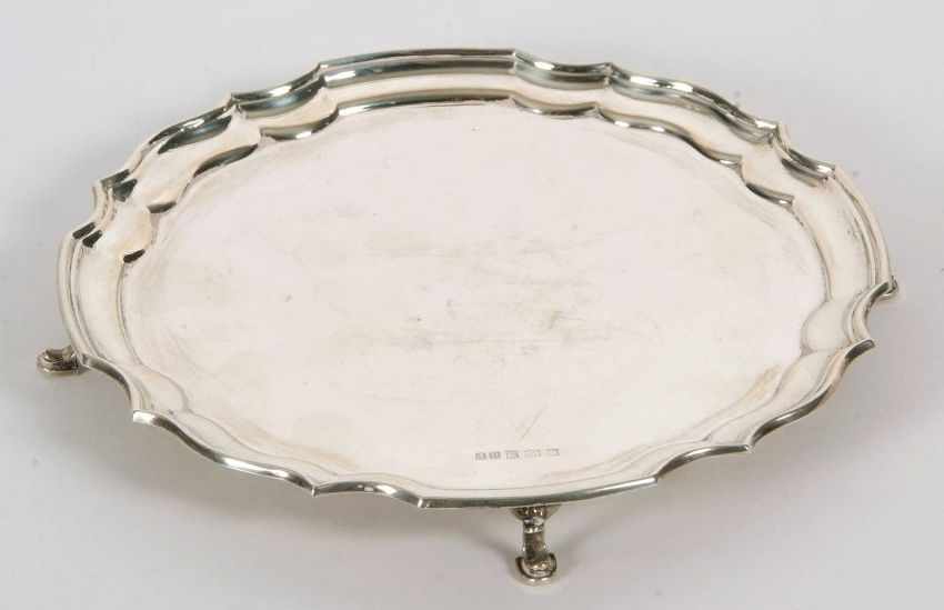 An Elizabeth II silver card salver in Georgian style of circular form with a Chippendale style border, supported on four hoof feet, 20cm diameter, hallmarked for Birmingham 1973, makers mark John Rose, 280gms