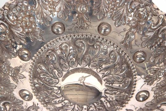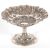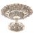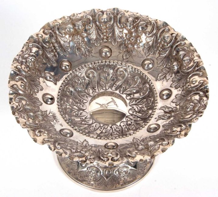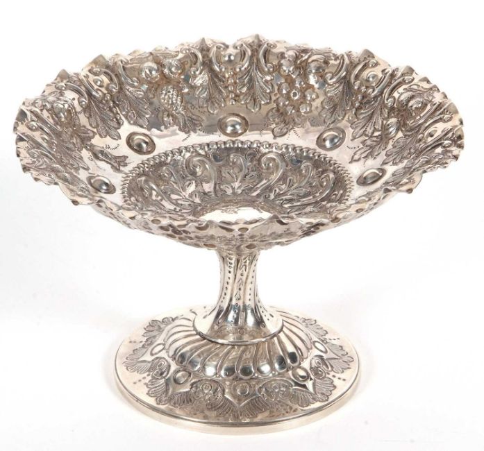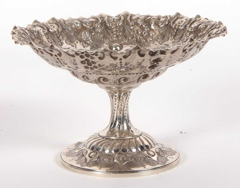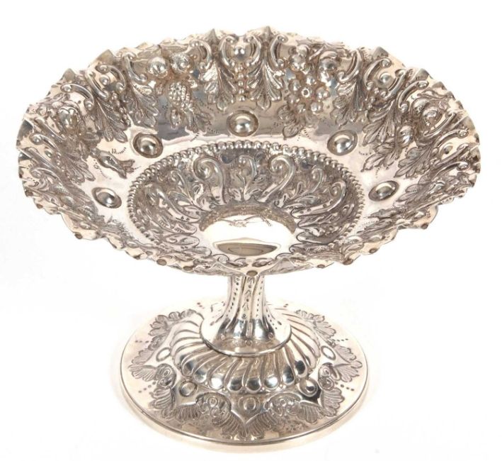 A small Victorian silver pedestal dish having a crimped rim and elaborately embossed all over with flowers, beads, foliage and scrolls, the centre engraved with a Knights hand holding a sword, hallmarked for London 1988, makers mark for Charles Edwards, 11cm tall, 178gms