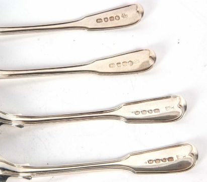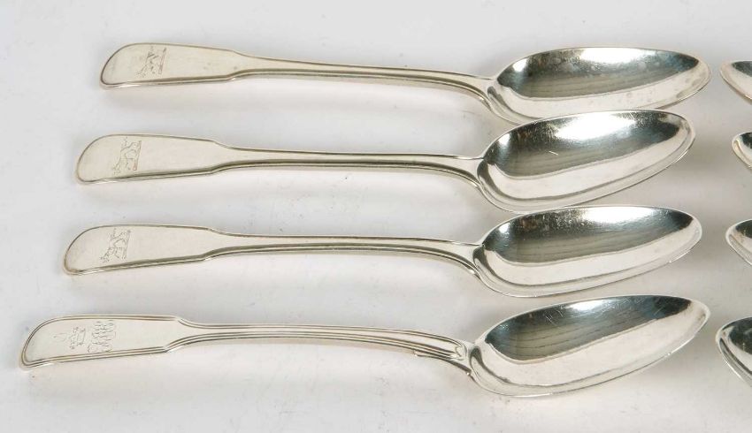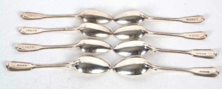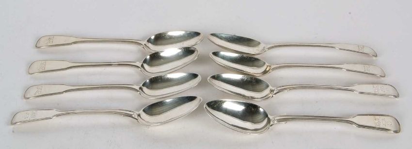 Mixed Lot: Five George III silver dessert spoons, fiddle and thread pattern, engraved with a canine and hallmarked for London 1803, makers mark William Ely I and William Fearn together with three George IV dessert spoons, fiddle and thread pattern, each engraved with initials below a coronet, London 1824, makers mark William Ely, Charles Ely and Henry Ely, 334gms