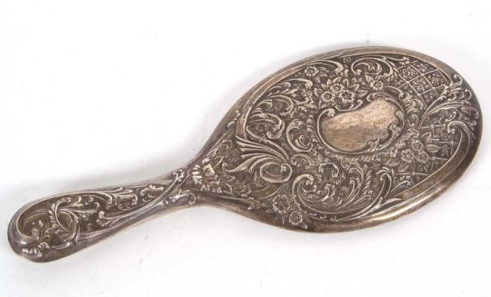 An early 20th Century silver back dressing table mirror elaborately decorated with scrolls, flowers and foliage etc around a vacant cartouche, hallmarked Birmingham 1903, makers mark for Williams Ltd