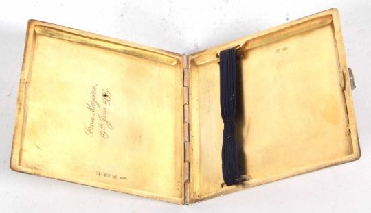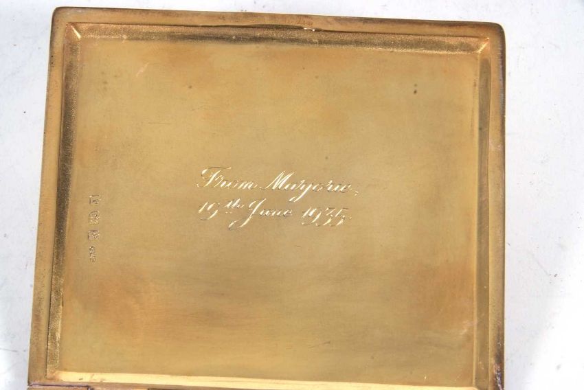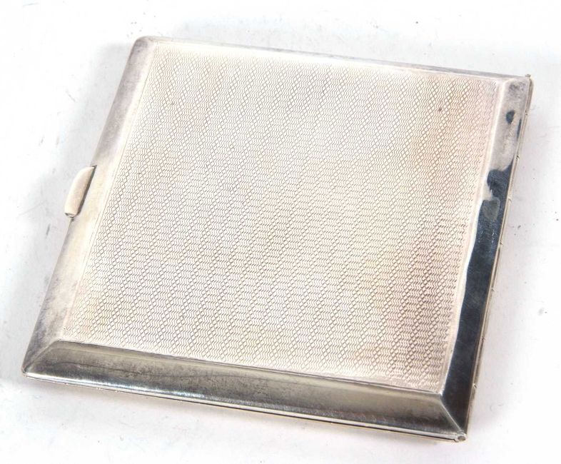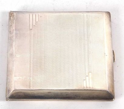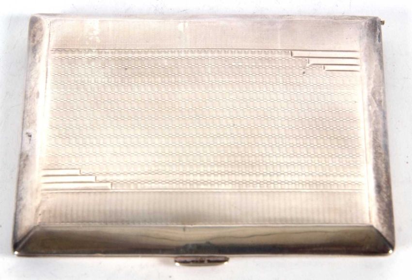 An Art Deco silver cigarette case of rectangular form, engine turned decoration, front and back having a full length hinge opening to a gilt interior, engraved inside with "From Marjorie 19th June 1935" , hallmarked for Birmingham 1937, makers mark for Turner & Simpson, 10x 8cm, 135gms