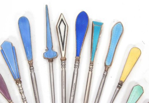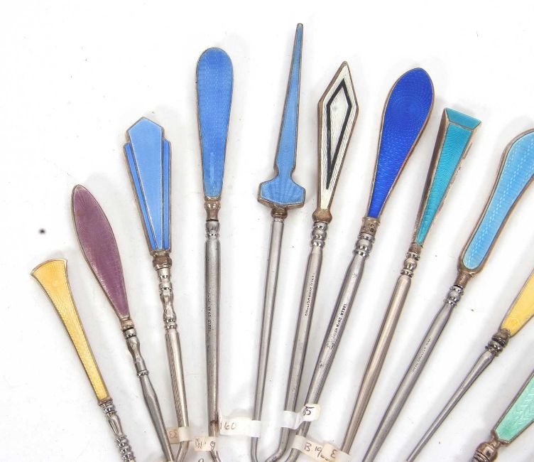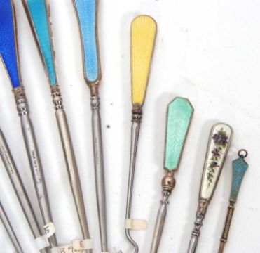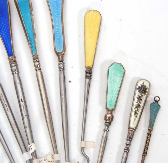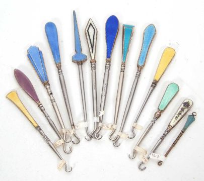 A group of thirteen mostly early 20th Century silver and enamel button hooks, various coloured gilouche enamel handles and makers and dates, two unmarked, (steel hooks)