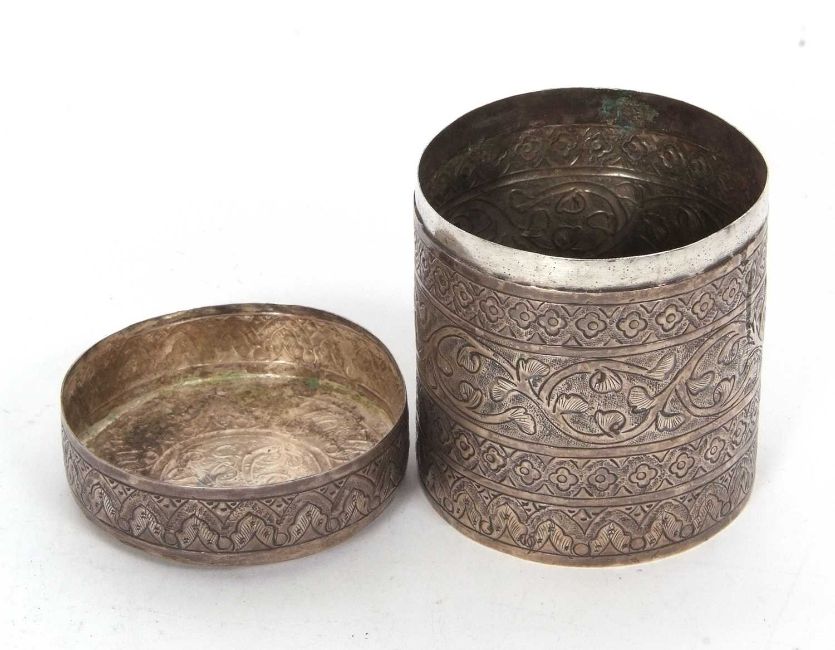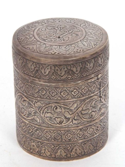 An antique eastern white metal cannister tea caddy decorated with bands of trailing leaves, scrolls etc,118gms, 9cm tall