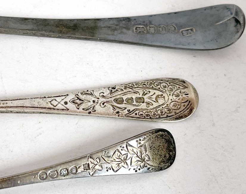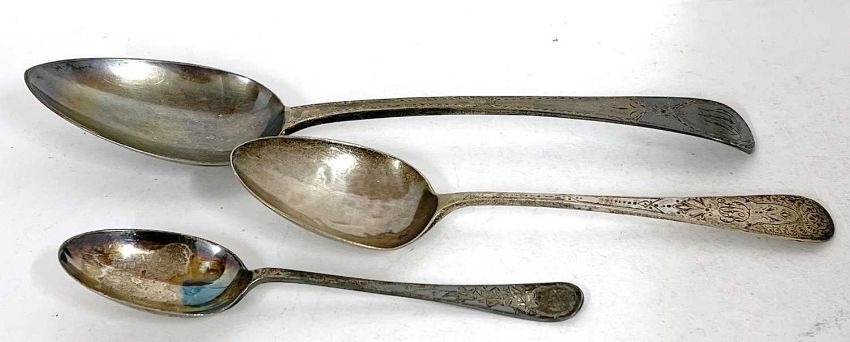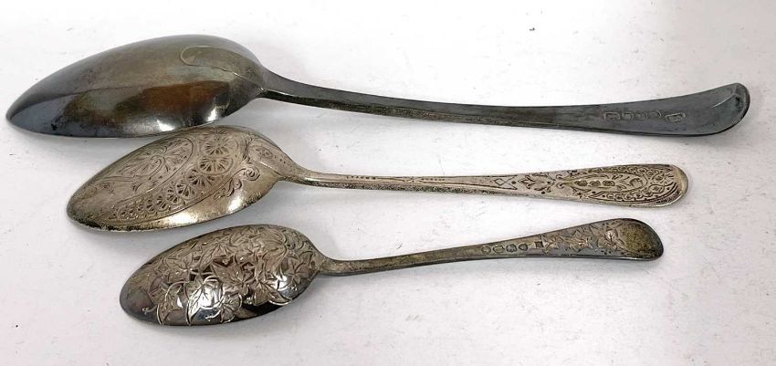 Mixed Lot: A George III silver tablespoon, bright cut decoration engraved with initials, hallmarked for London 1795, makers mark Stephen Adam II, a Victorian Old English Pattern dessert spoon, bright cut engraved, hallmarked London 1891, makers mark for Walter John Barnard together with a Victorian spoon, hallmarked London 1879 by William Hutton & Sons (3)