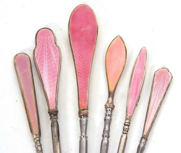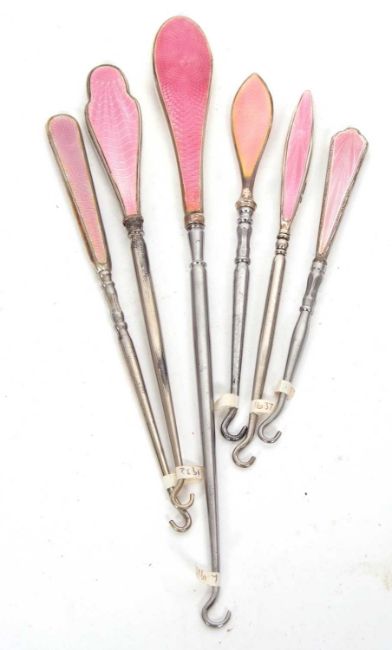 Six early 20th Century button hooks, each with pink guilouche enamel decorated handles, steel blades, five hallmarked 1925/38 (one unmarked) (6)