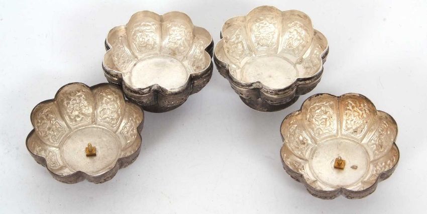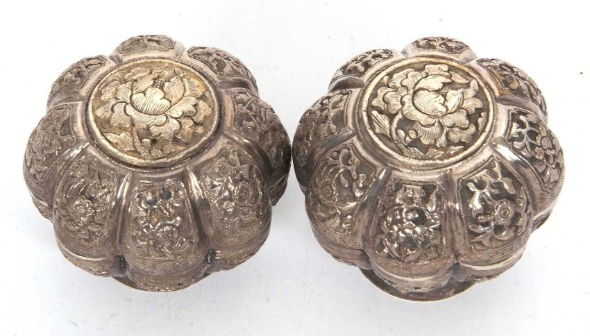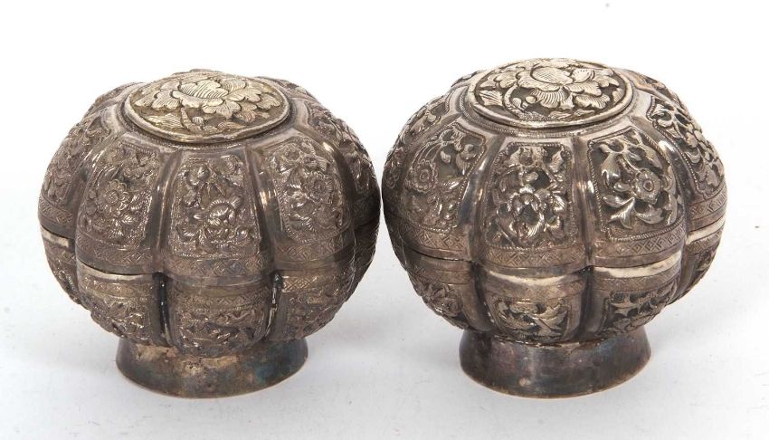 A pair of 19th Century Malaysian white metal betel nut boxes of floral design