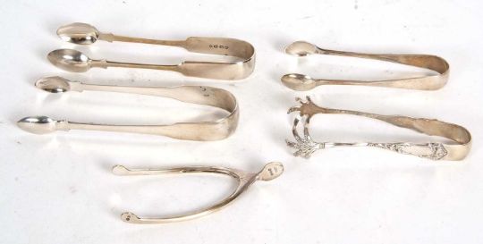 Group of four pairs of silver sugar tongs, and a pair of sugar nips, various dates/makers, 150gms