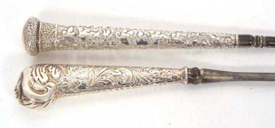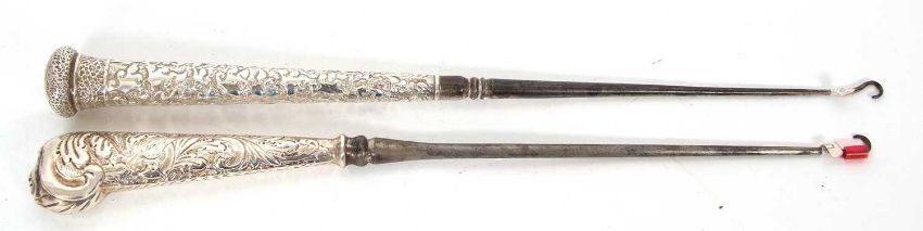 Two Victorian long handled button hooks, one with the handle in the form of a walking cane handle, chased and embossed detail and hallmarked for London 1888, makers mark J. W, 38cm long together with a pistol handled example with mask detail, chased and engraved all over with foliate scrolls etc, steel hook, London 1888, 38cm long, (2)