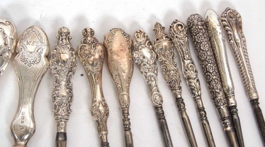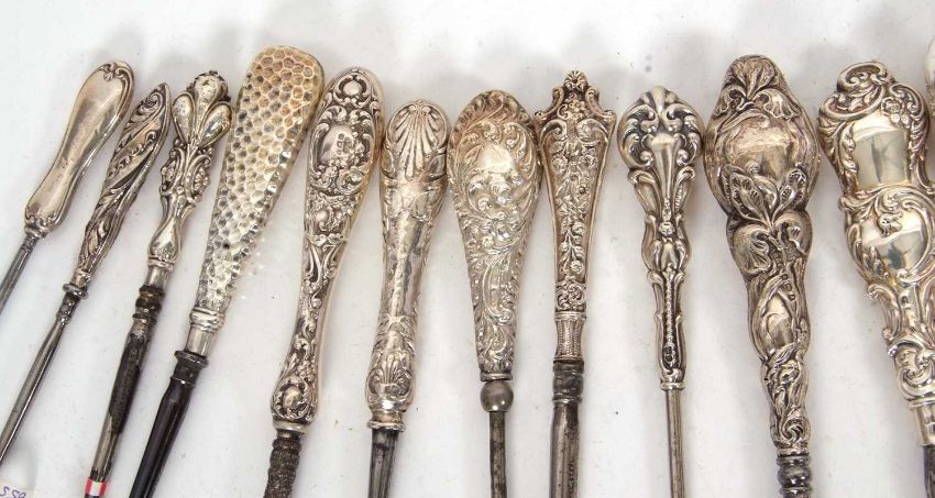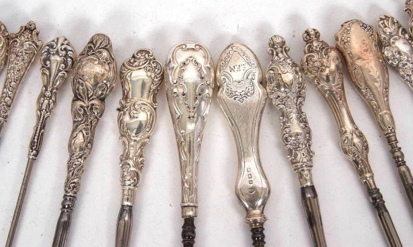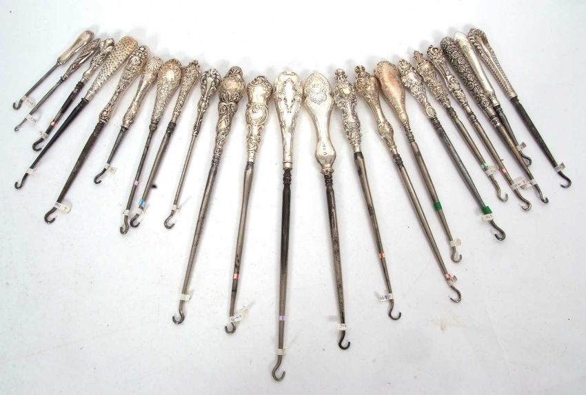 A group of twenty two late 19th/early 20th Century silver and steel button hooks, various dates/makers, 13-28cm