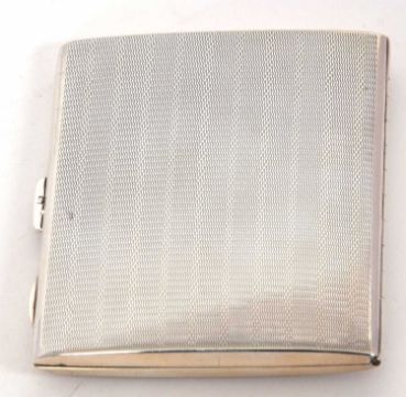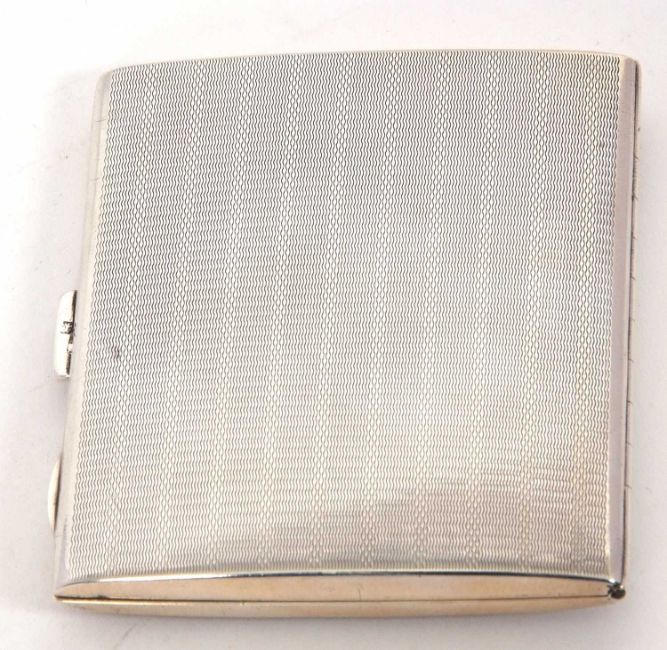 An Art Deco silver cigarette case of rectangular form, engine turned decorated with push button mechanism and applied thumb piece, hallmarked Birmingham 1927, makers mark is William Neale & Son, 8 x 7cm, 90 gms