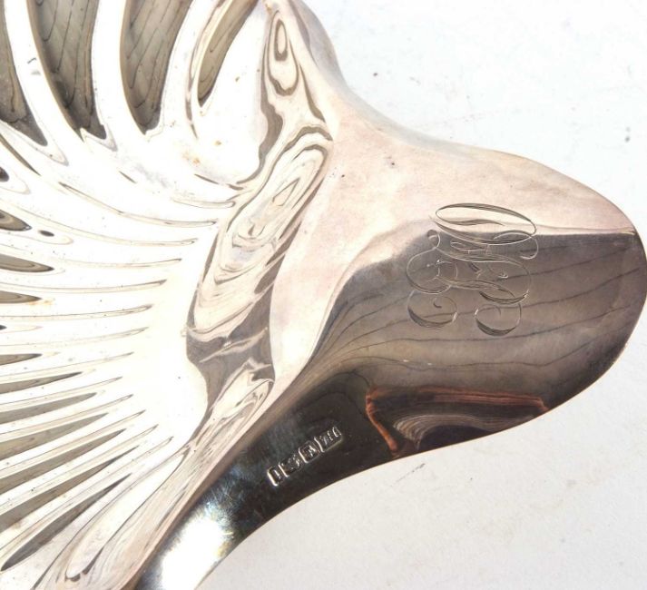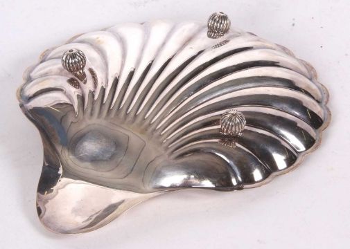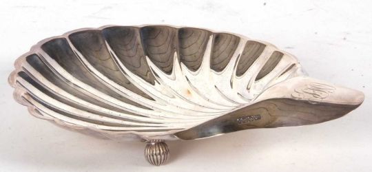 Large silver shell shaped dish, the handle engraved with initials, supported on three fluted ball feet, Sheffield 1901, makers mark for Atkin Bros, 24 x 20.5cm, 225gms