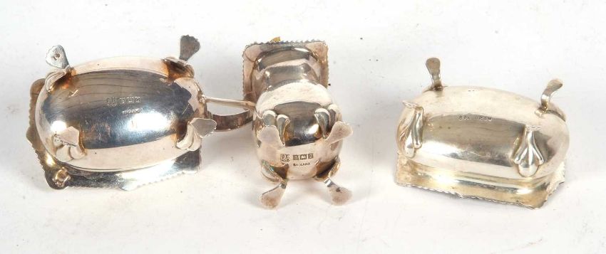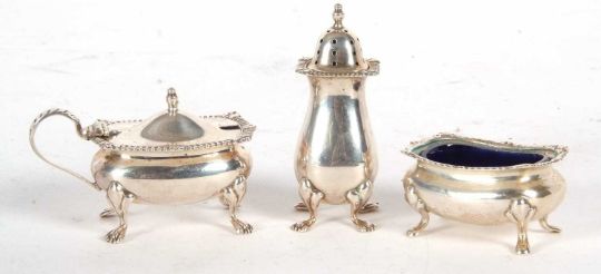 A matching silver pepper and hinged lid mustard and liner, Birmingham 1965, makers mark for Barker Ellis Silver Co, together with an open salt and liner, Birmingham 1910, makers mark for E S Barnsley & Co, weighable silver 112gms