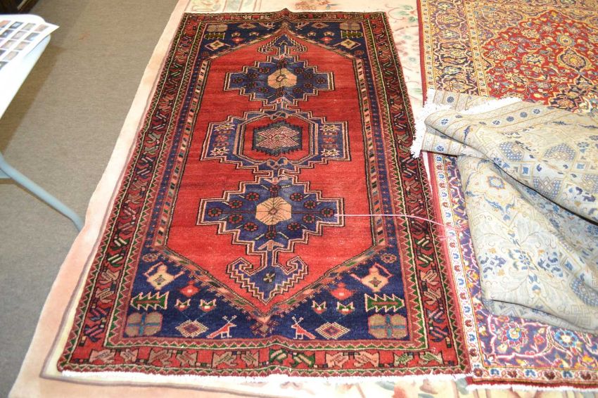 Modern Iranian Hamadan wool rug decorated with a large central red panel, 204 x 140cm