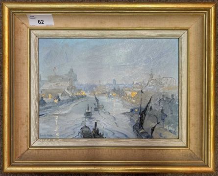 David Poole (British, b.1931), view across a river with barges and surrounding town /city scape, inscribed on backboard 'Norwich', oil on board, signed, 16x22cm, framed
