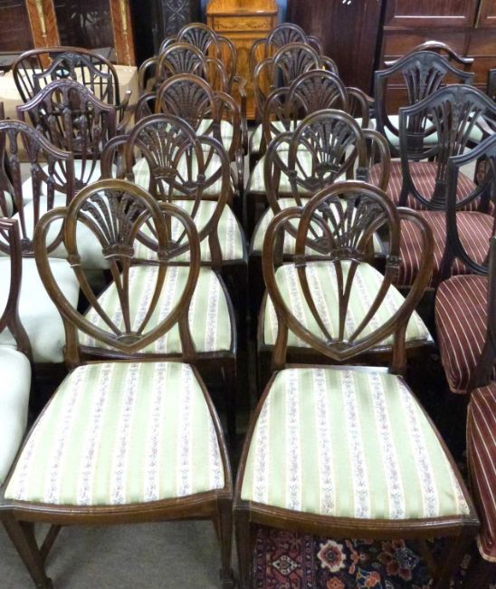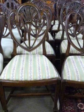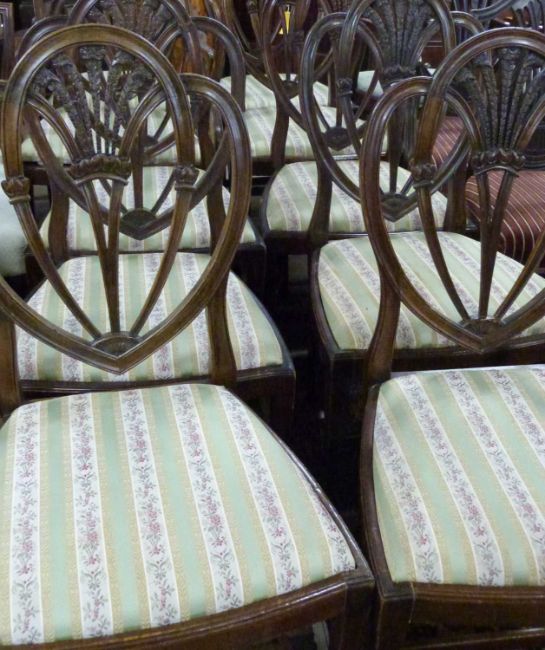A set of ten 20th Century mahogany framed dining chairs comprising two carvers and eight standard chairs with fleur de lis decoration to the backs and striped seats, some bearing Harrods labels