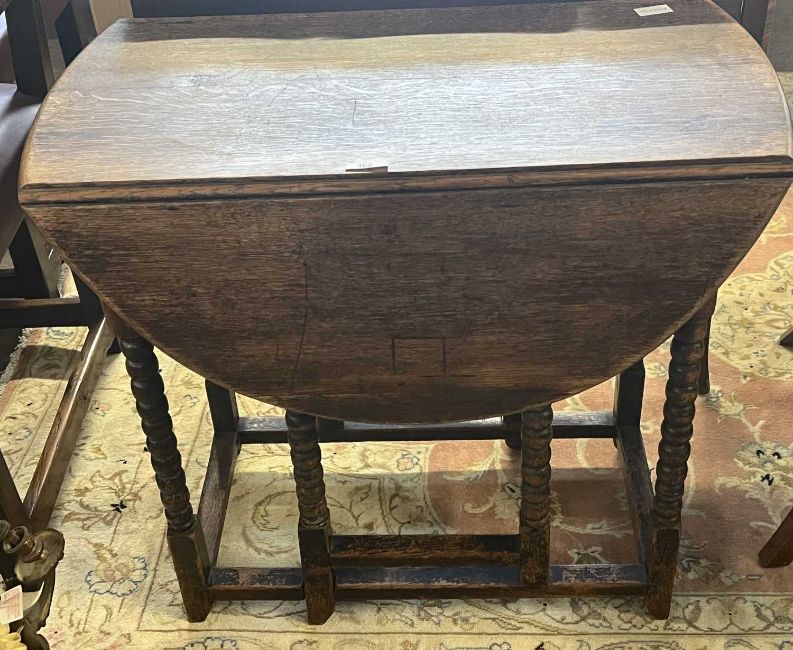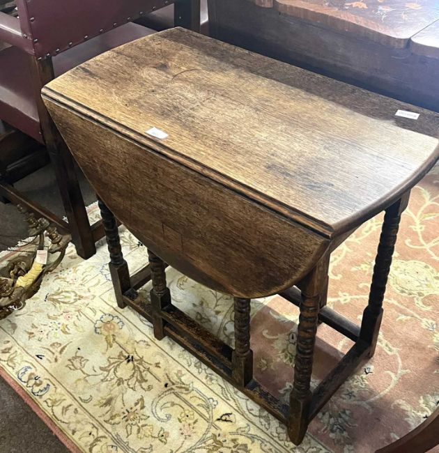 A small late 19th Century oak drop leaf table on bobbin turned legs, 73cm wide