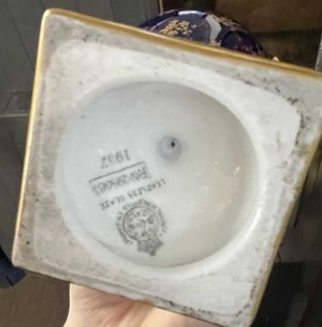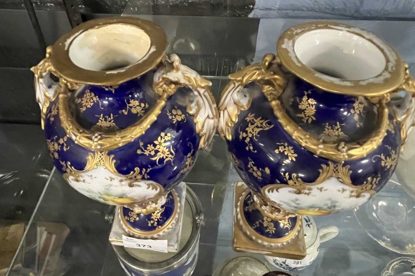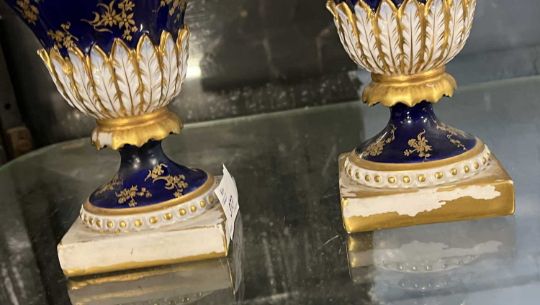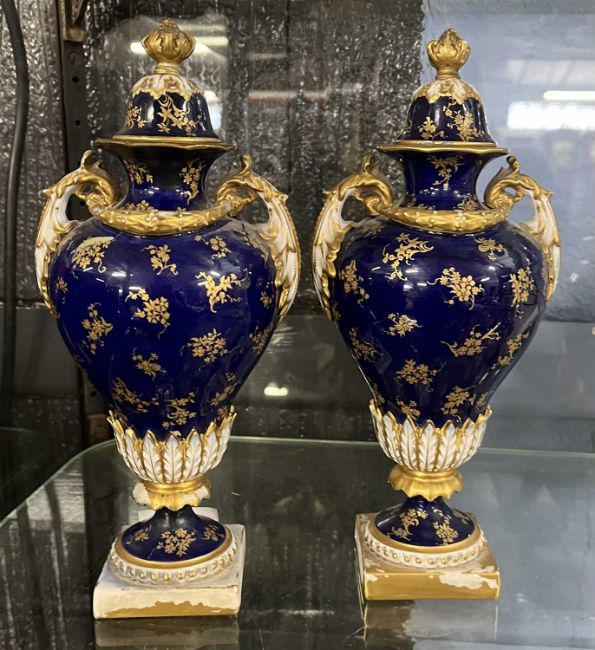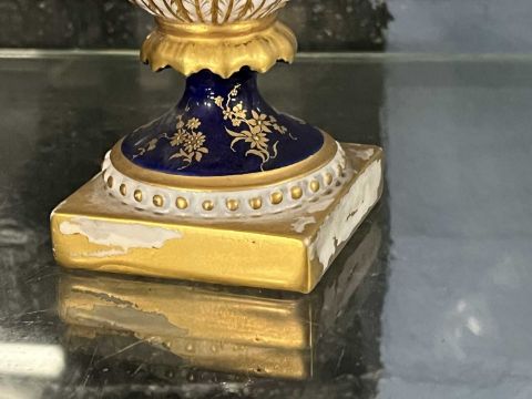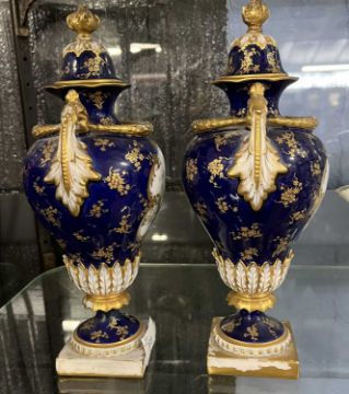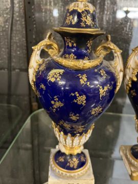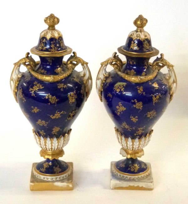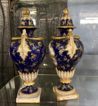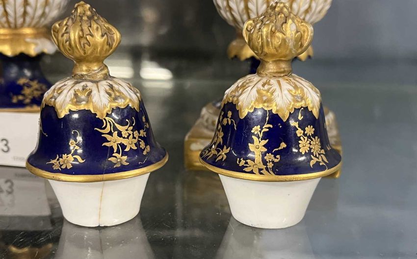 rim of one vase restored and cover with crakc and chip to inner portion both vases with some gilt loss