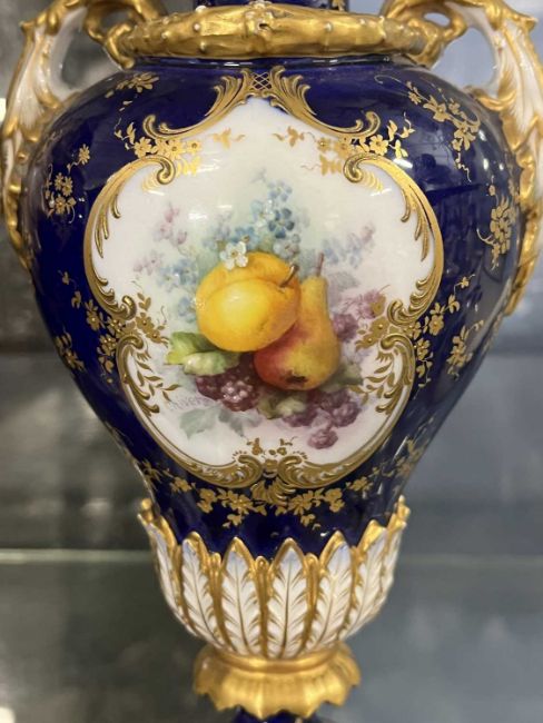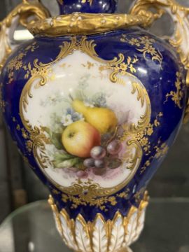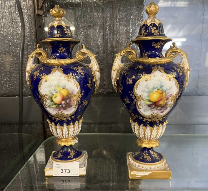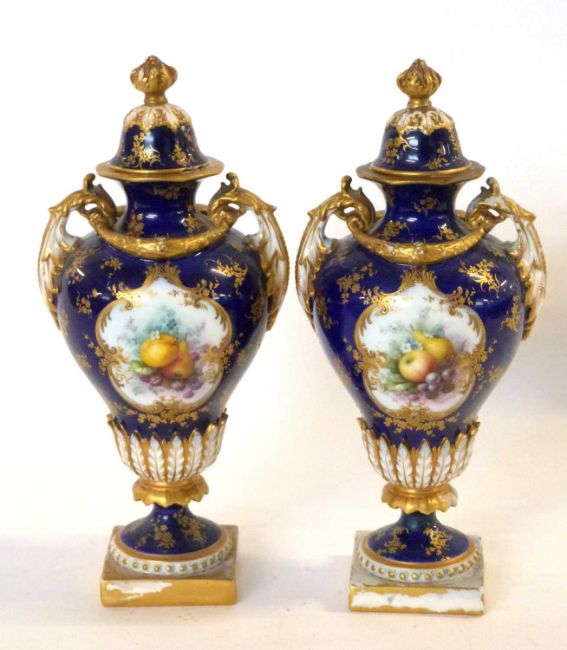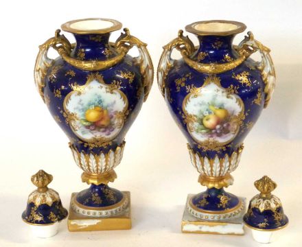 A pair of Royal Worcester vases, early 20th century the blue ground with gilt floral decoration and central cartouche of painted fruit signed by Chivers RW factory mark to base (one vase with restoration to rim.