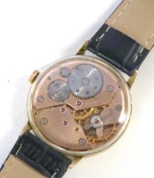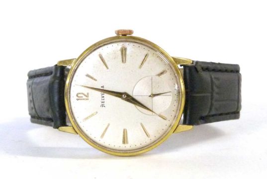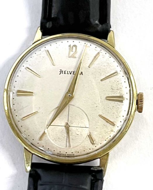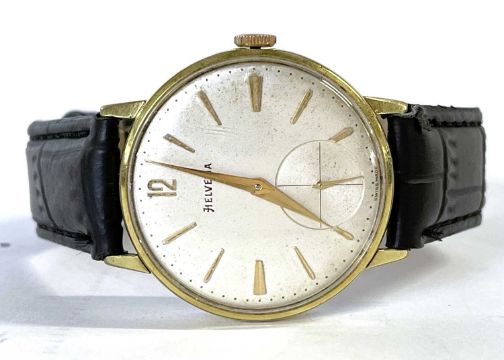 A 1960's Swiss Helvetia gentleman's skeleton-back wristwatch, with arrow hands and baton markers, subsidiary seconds dial, gold plated case, and running 17 jewell Swiss Mde Helvetia manual wound movement marked "H64" in a shield