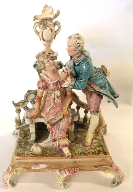 19th Century French Pottery Group of a courting couple decorated in majolica glazes on a rectangular base with scroll feet