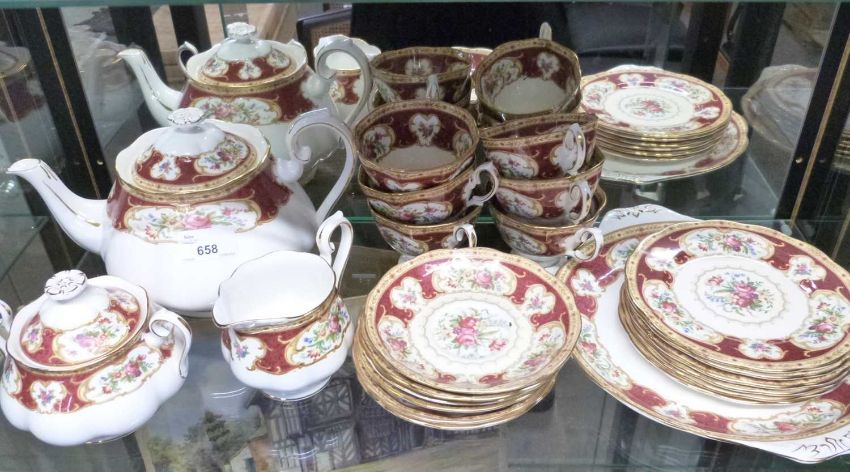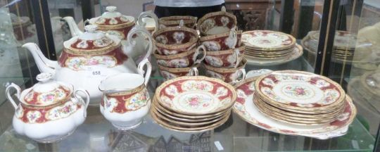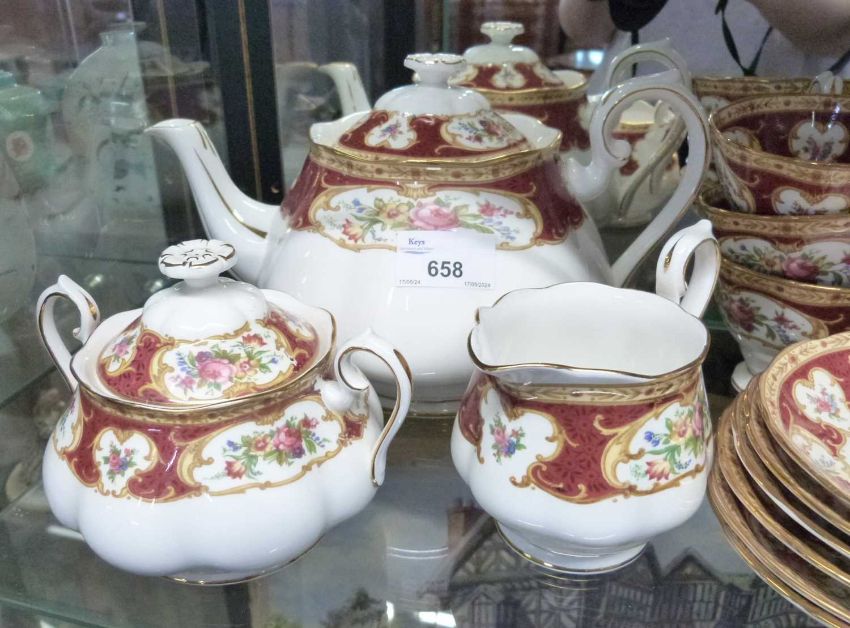 A Royal Albert tea set in the Lady Hamilton pattern comprising teapot, milk jug, sucrier and cover, six cups, saucers and side plates