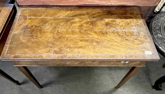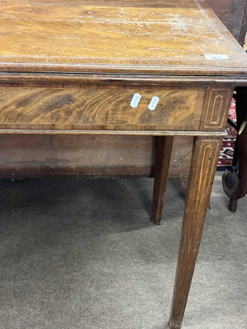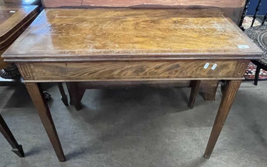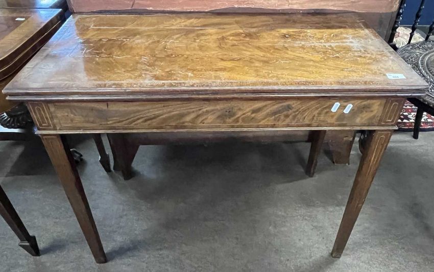 A Georgian mahogany and inlaid tea table of hinged rectangular form set on tapering legs, 92cm wide