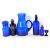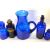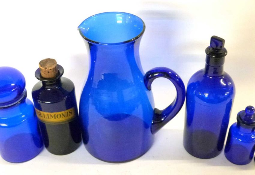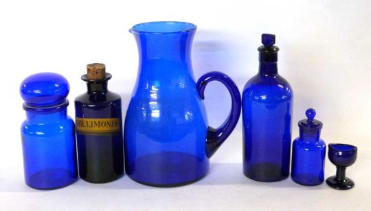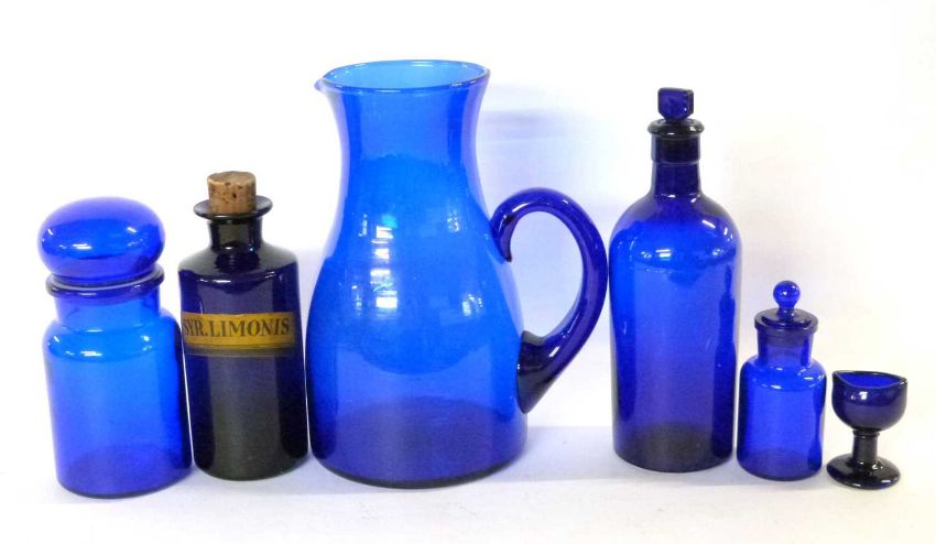 Group of Bristol blue glass wares including a large jug, eye bath and a chemists bottle