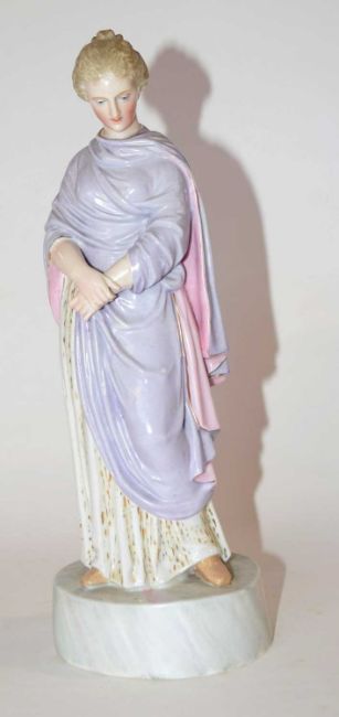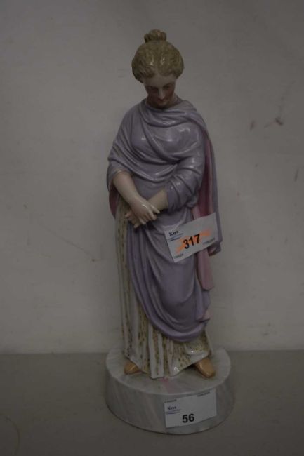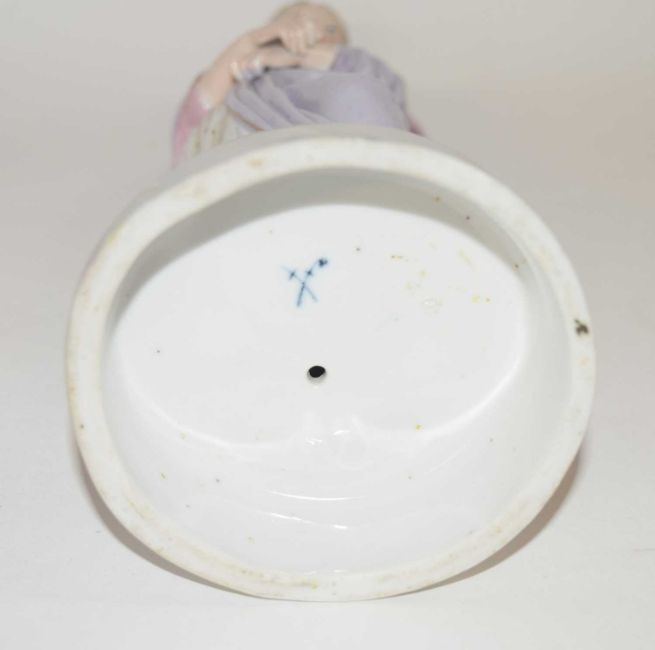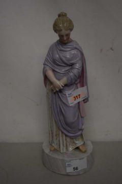 A continental porcelain figure of a medieval lady on circular base, blue cross swords mark to base, 26cm high
