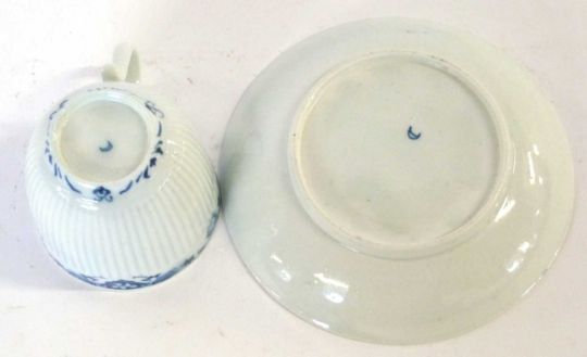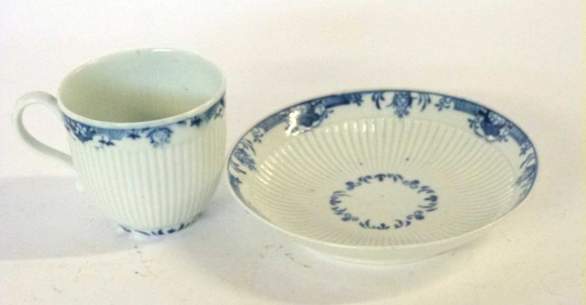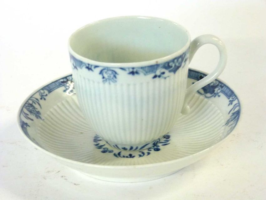 A Worcester porcelain cup and saucer, the ribbed body with a blue and white design to border