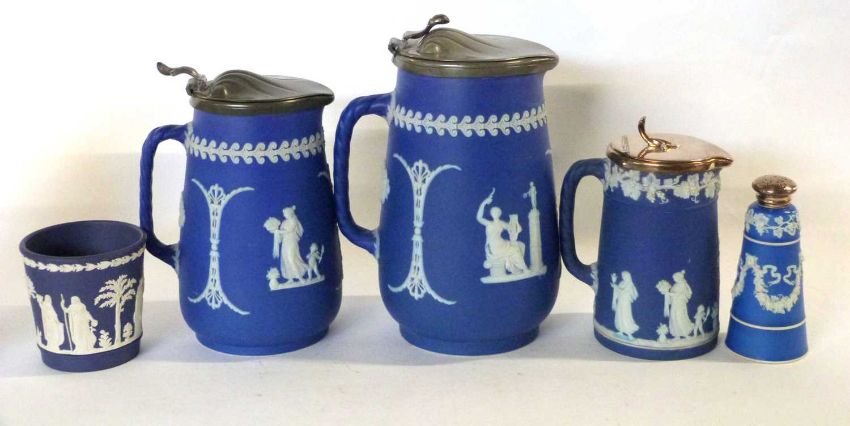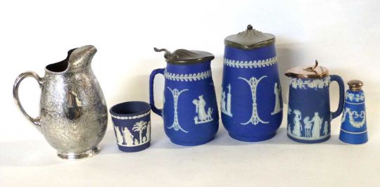 Group of late 19th Century Wedgwood blue jasper jugs of graduated size together with a small vase and white metal ewer