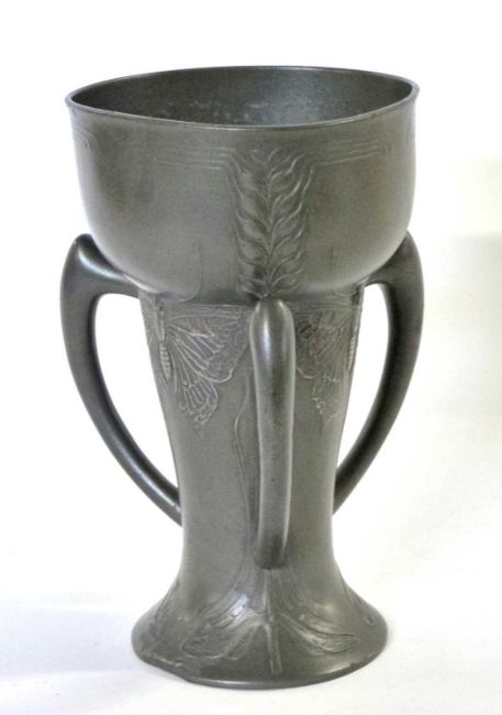 A German Jugendstil three handled pewter vase c1900 by the Kayserzinn Factory. Designer Hugo Leven. Nicely decorated with three large butterflies