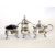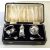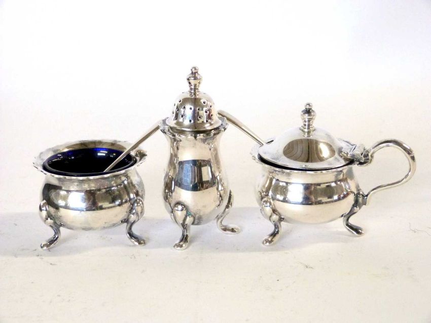 In perfect and unused condition this silver plated three piece cruet in velvet and satin lined leather box, sald and mustard pots with perfect blue glass liners, pepper pot and salt and mustard spoons, mid 20th Century