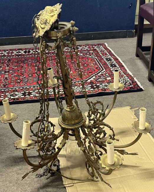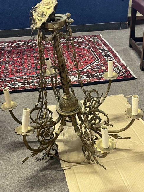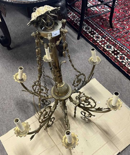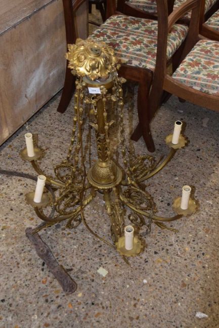 20th Century gilt brass six branch ceiling light fitting with scrolled foliate decoration, 70cm wide, 75cm high