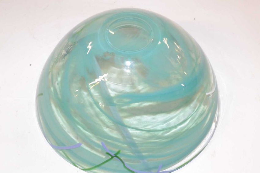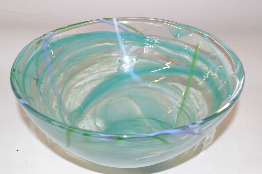 A Kosta Boda glass bowl with a green streak design, 22cm diameter