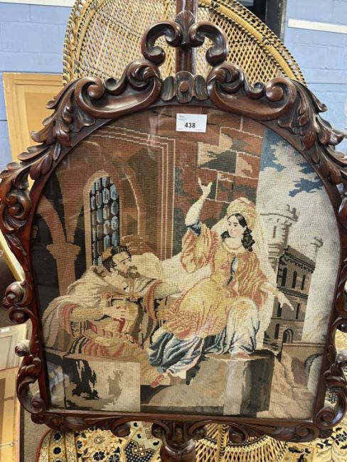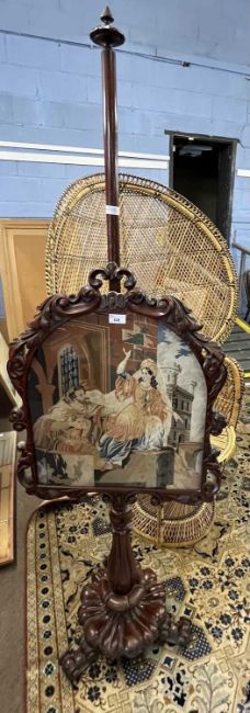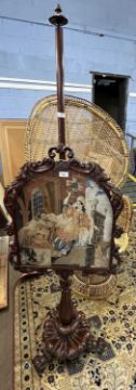 A Victorian mahogany framed pole screen, the panel decorated with a needlework classical scene, raised on a fluted base with four scroll feet, 179cm high