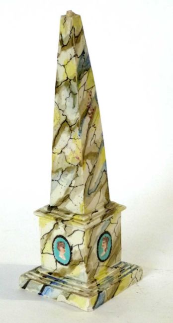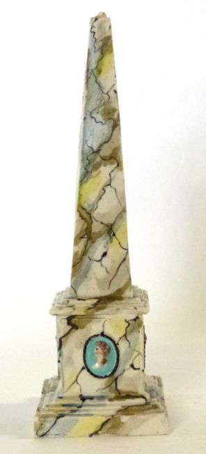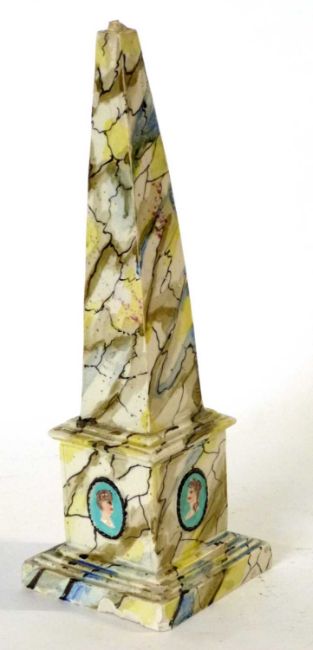A rare late 18th century Staffordshire pearlware obelisk. Neoclassical in style, painted with faux marble striations and classical portraits in relief to the bse. probbaly by Enoch or Ralph Wood.
