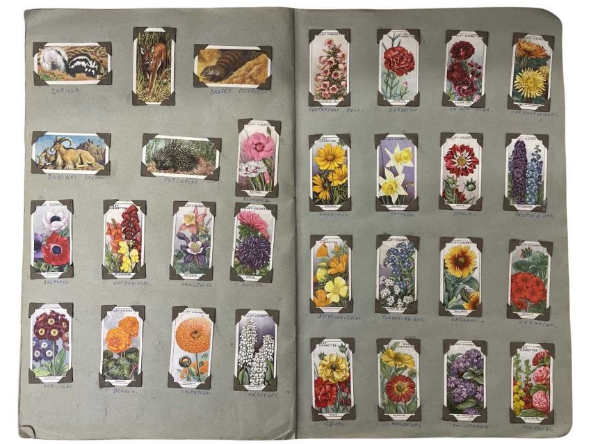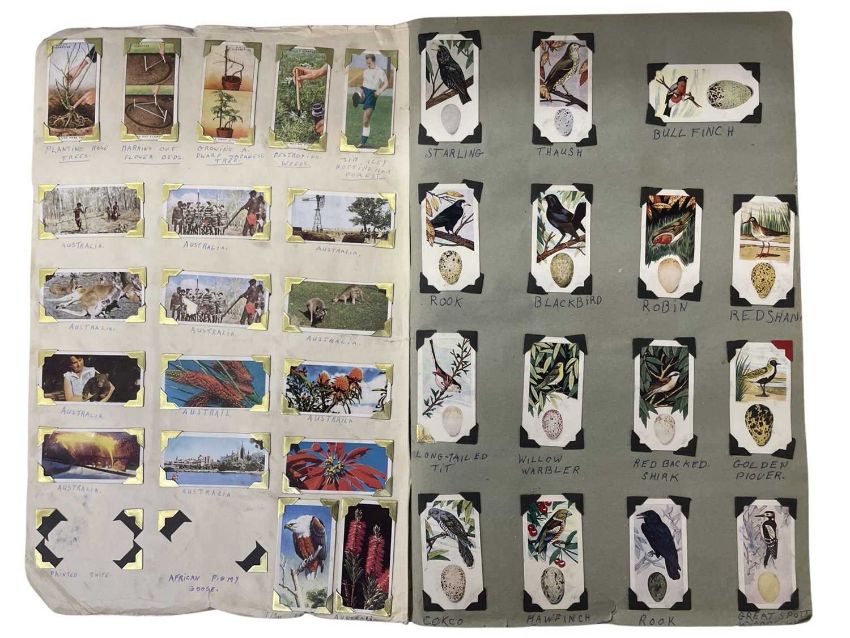 A vintage scrapbook containing a large quantity of various cigarette and trading cards, to include football, film stars, wildlife, botanical, aircraft etc