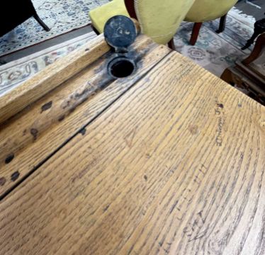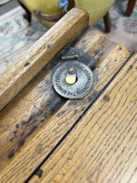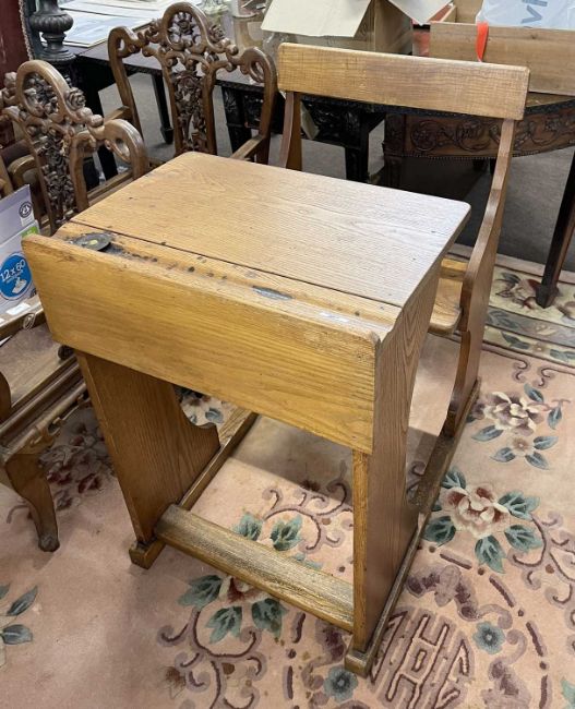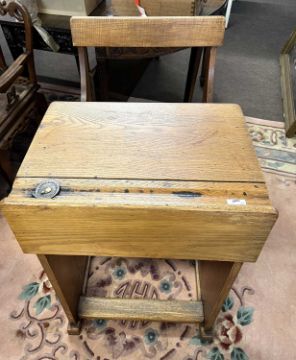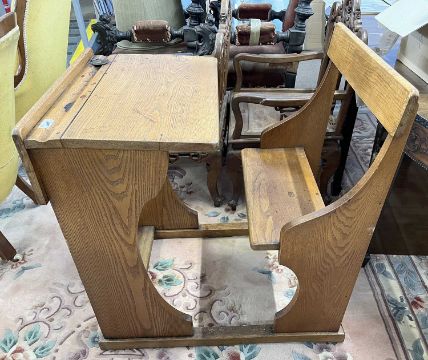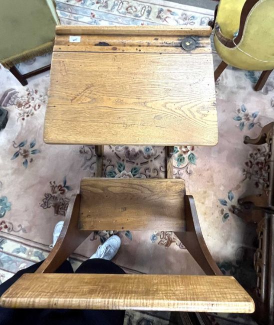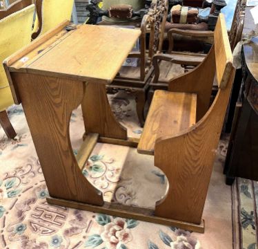 A mid 20th Century golden oak school desk, unusual feature as the seat is attached to the desk, metal inkwell cover Bennet, Glasgow & London