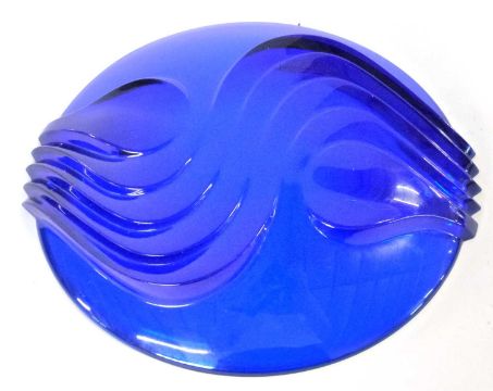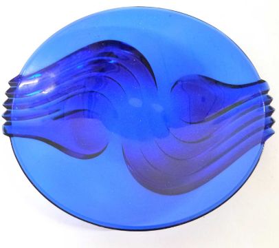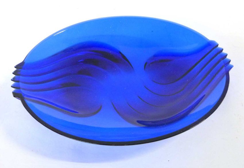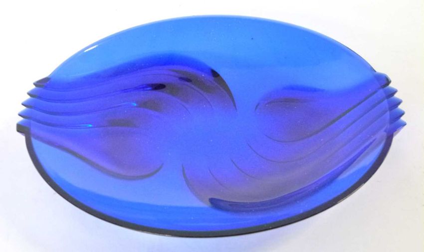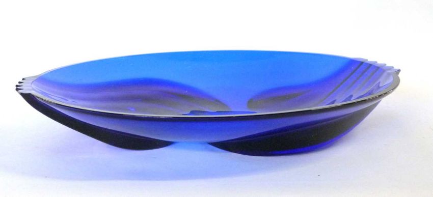 A large blue glass Art Deco style bowl together with a carved wooden model of a crocodile