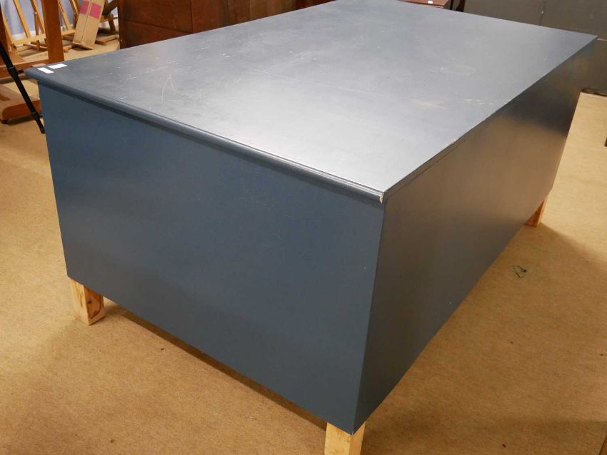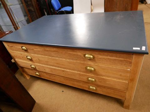 Stripped pine and painted four drawer plan chest fitted with brass cup handles, 156cm wide