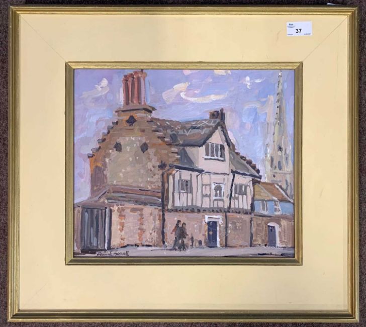 Patrick Boswell (British, b.1943), street scene with tudor buildings, distant cathedral and two strolling figures, oil on board, signed, 30x34cm, framed